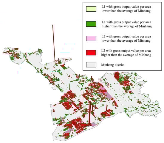 Figure 6 presents the spatial distribution of industrial land output in Minhang District. The industrial land with the highest output still kept manufacturing, although a large amount of industrial land with a comparatively higher output has been transformed. It was also found that large-scale and centrally distributed industrial land with low outputs was under transformation.