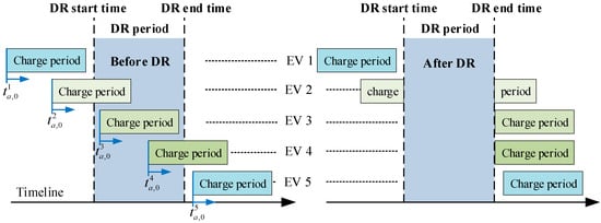 During the DR period, the charging EV reduces the charging time, or stops charging completely, to achieve the purpose of load reduction during this period. The change in the charging time of the EVs before and after DR is shown in Figure 1. When the EVs are not participating in DR, they start charging immediately after arriving home, at time . When the EVs participate in DR, the charging times of EVs 2, 3, and 4 are changed. The charging load during the DR period is shifted to after the DR ends. Since EV 1 and EV 5 do not perform charging during the DR period, their peak-shaving potentials are 0. It is worth noting that if an EV participates in DR and affects future travel demand, the EV does not participate in this DR event.