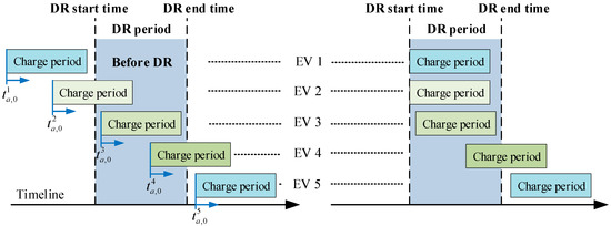 For valley-filling DR, during the DR period, the EVs are charged to the maximum extent, i.e., until the SOC reaches the upper limit. The charging changes of five types of EVs before and after participating in DR are shown in Figure 2. EV 1 and EV 2 do not charge immediately after returning home at time , and delay charging until the DR period, thereby absorbing the power generation load of the power grid. The times when EVs 3, 4, and 5 arrive home are after the DR start time, and their charging behaviors do not change.