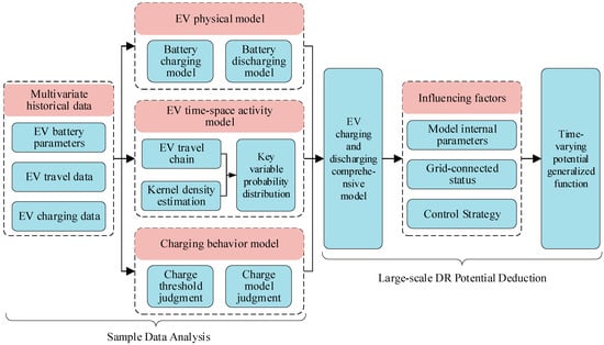 The rest of this paper is organized as follows: In Section 2, a large-scale potential deduction evaluation method based on small sample data is proposed, and the DR potential of the EVs under different strategies are calculated and analyzed. In Section 3, the time–space activity model and charging behavior modeling of the EV are established, and the probability distributions of the key parameters are fitted. A case study is presented in Section 4. Section 5 is a discussion of the results. Section 6 concludes the paper.