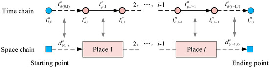 The time and space eigenvalues of EV n are extracted. Time characteristic values include time when arriving at location i, time when leaving location i, travel time of the ith trip , and parking time at location i. The first travel time is . Taking , , and as input variables, the arrival time and departure time can be calculated using Equations (4) and (5).