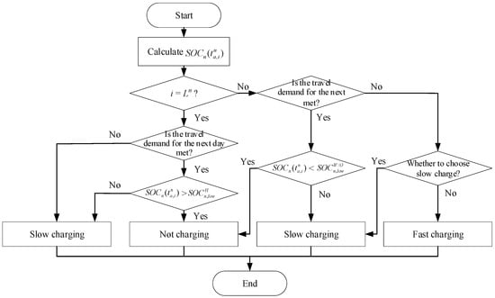 Considering that after the EVs leave home, they will charge in other areas outside the home, which will affect the charging load at home to a certain extent [26]. In addition, the charging and discharging behaviors of the EVs also affects the grid-connected state S of the EVs. In this section, the EV charging judgment model is constructed based on EV historical charging habits, as shown in Figure 5. Combined with the time–space activity model, it further calculates the SOC changes of the EVs over the course of a day.
