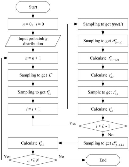 - Sampling to obtain the parking time. Calculate the next travel time based on Equation (5).