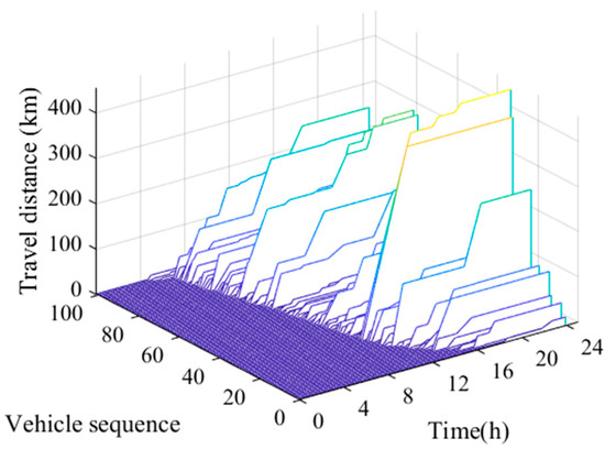 Therefore, in the case study, data come from the travel database of the U.S. National Household Travel Survey (NHTS). The NHTS data are the main source of information on daily travel linked to individual personal and household characteristics, socio-economic characteristics, vehicle ownership, and vehicle attributes. Since there are few travel records for EVs, this paper selects the travel data of all types of vehicles, including fuel vehicles, for analysis. In the database, travel information of each trip for each vehicle during a day is recorded, including start and end time, driving time, driving distance, and parking time [31]. The NHTS data were collected between April 2016 and May 2017, and are the nation’s source of information regarding travel by U.S. residents in all 50 states and the District of Columbia. On the basis of the original data, after cleaning and processing, the recorded data of 678,000 trips made by 101,005 households were finally selected. Among them, there are 173,296 complete travel chain data, where the vehicle departed from home and finally returned home. The daily travel records of 100 vehicles are shown in Figure 7. The vehicle sequences are sorted in the order of initial time of leaving home. It can be seen that there are differences in the travel behaviors of different vehicles. During the travel process, the corresponding times and travel distances are fully recorded.