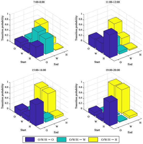 For the spatial transition probability , the transition probabilities of different starting points and corresponding end points are different. At the same time, the transition probabilities are also different for different time periods in a day. Therefore, the spatial transition probability is determined by the time period and the current location [25]. is discretized at a certain time interval, and a three-dimensional matrix of the EV, with a scale of M × 3 × 3, can be obtained. This matrix is defined as the travel location transition probability matrix. M is the number of time intervals after discretization, and there are three types of travel locations, H, W and O. Taking a cross-section at any time interval , a 3 × 3 two-dimensional matrix is obtained, as shown in Equation (12):
