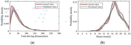 It has been found that the above characteristic values, once determined, can fully reflect the daily travel behavior of residential consumers [20]. In this paper, MC simulation is used to generate each characteristic value. The basis of MC simulation is to obtain the probability distribution of each characteristic value [21,22]. Existing research mainly uses the conventional form of probability distribution to fit, such as normal distribution, etc. The fitting results are acceptable under certain conditions. However, for statistical data exhibiting distribution characteristics sufficiently different from the common distribution form, such as in a multimodal distribution, fitting is no longer applicable. To this end, this paper conducts a probability analysis on the characteristic values of residential consumers’ actual travel, uses KDE to fit the actual distribution of the characteristic values, and then obtains the probability density curve of each characteristic value.