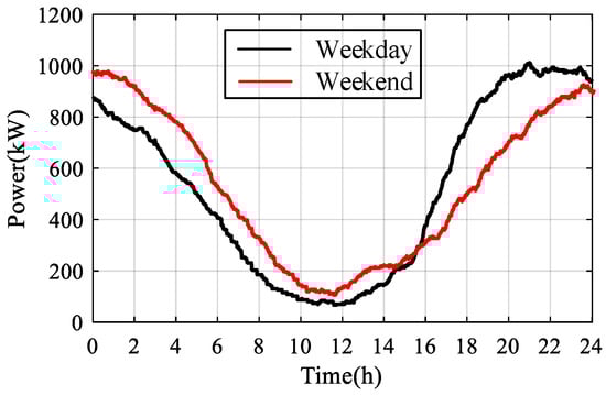 In residential areas, the charging load curve of electric vehicles is affected by the daily travel behavior of the residents, as shown in Figure 10. The load is at a trough around 11:00 and peaked at around 23:00, which is consistent with the research results of [10,12]. On this basis, the DR potential of the EV is calculated at different time periods. The variation trends in potential within a day are consistent with the charging loads, and the fundamental reason for this is that the spatial location of EVs is constantly changing, and the number of vehicles in the residential area varies among different time periods. In non-residential areas, the trend of potential changes is reversed, as shown in the results of [14].
