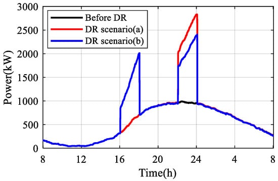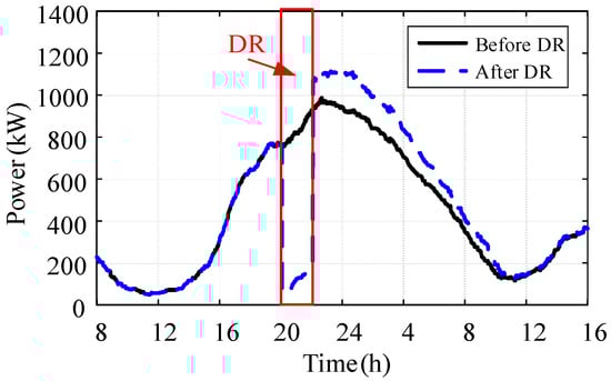 On the basis of EV charging load, a certain period of time is considered to carry out DR, and the time-varying potential of DR in this period is calculated. The start time of DR is set at 20:00 and the end time is 22:00. During this period, peak-shaving DR is performed; the loads of the EVs before and after DR are shown in the Figure 11. During this DR period, the load peak-shaving potential averaged 726 kW, which is 82.97% of the average EV load in this period.