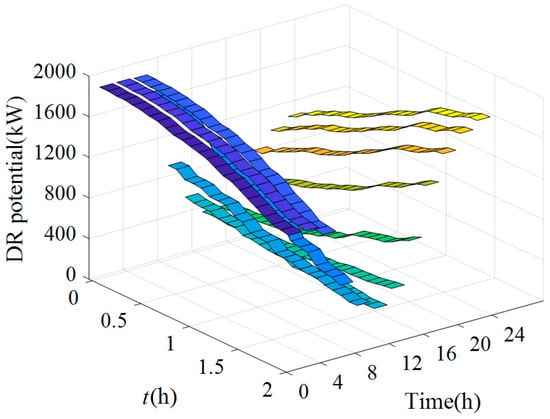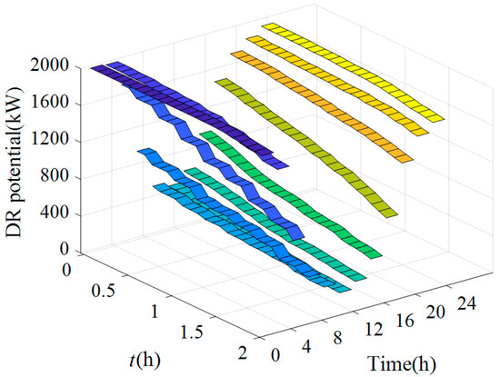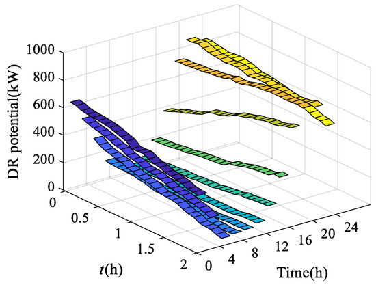 For each DR period, the potential of peak-shaving type is shown in Figure 12. It can be seen that the DR potential is constantly changing during the DR period, and the direction of change is positively correlated with the slope of the charging load curve in Figure 10. This is because the change in the number of the EVs in the residential area directly determines the change in the continuous potential of DR.