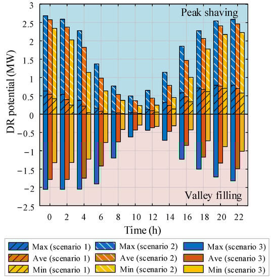 Due to the time-varying potential in the DR period, the quantitative indicators of DR potential are set, which are the maximum response, minimum response, and average response during the DR period. Under three different DR strategies, the calculation results of the maximum response, minimum response, and average response are shown in Figure 15. Scenario 1 represents the peak-shaving type DR, and the EVs suspend charging during the DR period. Scenario 2 represents the V2G discharge type DR, and the EVs discharge to the grid in the reverse direction during the DR period. Scenario 3 represents the valley-filled DR, and the EVs are charged to the greatest extent during the DR period.