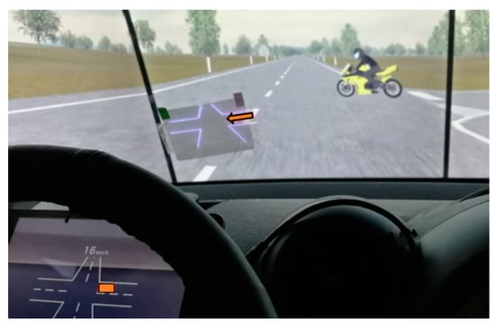 A tablet PC mounted in front of the steering wheel displayed a motorcycle icon when a motorcycle was recognized by the vehicle’s sensor system. In parallel to this, the motorcycle icon was displayed on a head-up display (HUD). The warnings system used data from a simulated vehicle-to-vehicle (V2V) communication. The warnings were triggered when a predefined time-to-collision threshold calculated from the current speed and direction was exceeded.