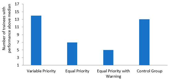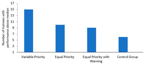 As illustrated in Figure 2, the number of learner drivers with a performance above the median (Med = 51.50) was greater in the groups that trained with variable priority and in the control group, as compared to the groups with equal priority and equal priority with warning.