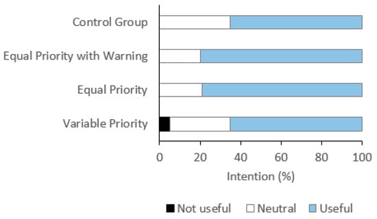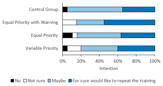 As expected, the variable priority training resulted in the best motorcycle perceptibility on urban roads with high contrast, demonstrating that this group of learner drivers benefited from objective performance feedback that highlighted performance benefits and decrements depending on the priority given to subtasks. According to Gopher et al. [43], this training effect indicates that variable priority training results in “response strategies that can be employed flexibly to meet task demands” [43] (p. 147). A point of interest is that the use of a motorcycle warning system resulted in the lowest performance in the group that trained with equal priority and warning in post-test when they could not use the warning anymore. The reason for this may be that the learner drivers in this group developed an over-reliance on the warning. A slightly better performance was observed in the group that trained with equal priority testing that did not use a warning system. The fact that the control group performed so well on urban roads with high contrast is difficult to explain. The control group trained without traffic and, thus, these trainees could concentrate all their resources on practicing vehicle control and learning the road layout.