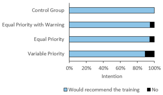 As illustrated in Figure 5, the intention to repeat the training in future, if given the possibility, was reported by most of the learner drivers (e.g., for sure or perhaps). Only a few trainees stated that they would not continue the training or were not sure about doing so. Most of the learner drivers would recommend the driving simulator training to other learner drivers (Figure 6).
