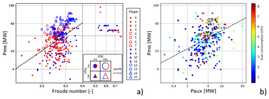 Main engine power Pme of the EEA Ro-Pax ships: (a) vs. Froude number, with vessel type Equation (2) portrayed as marker feature (see inset), and the Pme threshold of Table 3 is given as a horizontal dashed line (HSC lay in the region to the right of the vertical dashed line); (b) vs. auxiliary engine power Paux, only for non-HSC, with marker colours indicating fuel consumption rates. Both panels are at the log-log scale and the slant dashed line is identified via least-square fits.