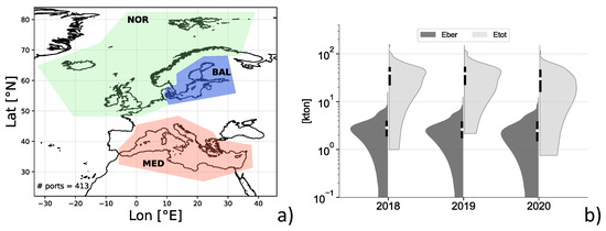 (a) Ports called at by ferries in 2018–2020 (markers) and the geographical regions considered (coloured areas); (b) Violin plots of Eber and Etot during the three years. The black cord at the edge of each half-violin spans the 95% confidence interval of the median, which is represented by the white dot.
