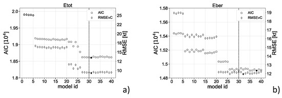 Scores of the 40 candidate models for: (a) Etot; and (b) Eber. The chosen model (#30) is highlighted with a vertical dashed line. The conditional RMSE in the validation set and the AIC are shown as diamonds and circles, respectively. Their minimum values are indicated by filled markers.