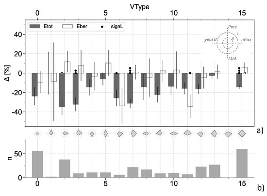 where H is the Heaviside function, and are the vessels’ variables listed in Table 3 together with their threshold values . These thresholds were selected as the medians of the distributions of . The VType = 0 therefore consists of low main-engine power, low passenger-carrying capacity, short length and old ferries. This is the reference class for the subsequent inferential analysis conducted in Section 6. Other classification criteria would in principle be possible, depending on ferry data availability. E.g., annual revenues, lane-meter capacity, or bed capacity could also be considered [14].