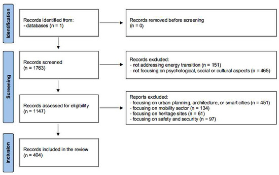 The actual query, which is reported below, consisted of two parts. The first one contained operands related to the analysis contexts, including relevant disciplinary domains (i.e., psycho*, cultur*), and the spatial/relational levels (e.g., communit*, household*, etc.). The second part contained operands selected to capture studies related to the subjects and topics relevant for the review (e.g., decarbon*, low-carbon, post-carbon, coal, etc.), purposefully eliciting literature related to change and stability in energy systems, i.e., energy transition, path dependency, and carbon lock-in [46,47].