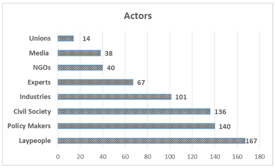 Actors considered in the articles covered by the literature review. Numbers refer to the number of articles considering a specific actor.