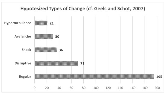 - Typology of change, i.e., the transition pathway described in the study (e.g., regular, hyper-turbulence, shock, disruptive, avalanche), cf. [57]. (Quoting the authors, we defined the categories as follows ([57], p. 404). Regular: “corresponds to environments that regularly experience a low intensity, gradual change”. Hyper-turbulence: “corresponds to environments that feature a high frequency of high-speed change in one dimension”. Shock: “corresponds to environmental changes that are rapid and high in intensity, come rarely, and are relatively narrow in scope. A specific shock may dissipate and disappear after a while, returning to the baseline, or it may lead to a stepwise structural change”. Disruptive: “corresponds to changes that infrequently occur, develop gradually, but have a high-intensity effect in one dimension”. Avalanche: “occurs very infrequently, but is of high intensity, of high speed, and simultaneously affects multiple dimensions of the environment. Avalanche change leads to permanent changes in the environment”);