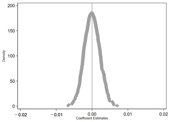 (2) Randomly simulated experimental group. Referring to the approach of Zhang et al. [40], by randomly selecting a sample comparable to the original sample experimental group as a new experimental group, the sample was repeated 800 times and baseline regression was performed based on model (1). Descriptive statistics on the estimation results showed that the mean value of the 800 estimated coefficients was −0.0000414 and the mean value of the p-value was 0.5076, which means the original hypothesis that the coefficient of the core variable in the placebo test was 0 could not be rejected. Figure 2 and Figure 3 further plot the distribution of the density and p-value of the regression coefficients, and it can be found that the estimated coefficients obtained based on the random sample are normally distributed with a mean value of approximately 0, while the true estimated coefficients in this paper (column 4 of Table 4) are clearly outliers, so the placebo test performed on the basis of the experimental group selected from the random simulation again shows robust results.