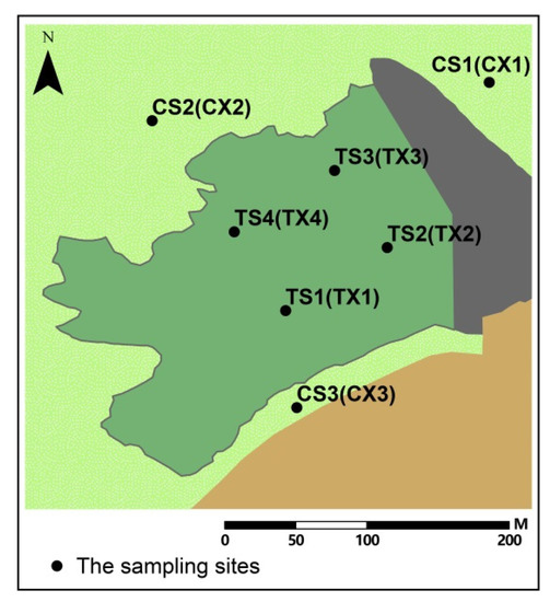 The samples for measuring physicochemical properties and the heavy metal/metalloid content of the soil were collected from two vertical depth profiles, 0–5 cm and 5–15 cm, in the uranium tailings pond and its adjacent area. The 14 soil sampling points are shown in Figure 1, which are basically consistent with those of soil radionuclide measurement sample [19]. As shown in Figure 1, “T” represents the internal area of the uranium tailings pond, “C” represents the adjacent area around the tailings pond, “S” represents the sampling depth of 0–5 cm, and “X” represents the sampling depth of 5–15 cm. The samples at depths of 0–5 cm in the uranium tailings pond are named TS1, TS2, TS3, and TS4, and those at depths 5–15 cm in the uranium tailings pond are named TX1, TX2, TX3, and TX4. The three sampling points in the adjacent area of the tailings pond are named CS1, CS2, and CS3 at depths 0–5 cm, and samples at depths 5–15 cm are named CX1, CX2, and CX3. For more sampling details, refer to our previous study [19]. The mixed samples processed at each sampling point were divided into three parts. One part was placed in a premarked sampling bag for the analysis of soil radionuclides, one part was placed in a premarked sampling bag for the measurement of soil physicochemical properties and heavy metals/metalloids, and the remaining part was used for the measurement of other items.