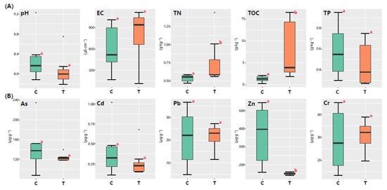 Physicochemical properties (A) and heavy metal/metalloid contents (B) of soil in the uranium tailings pond (T) and its adjacent area (C). Different lowercase letters indicate a significant difference between groups (p < 0.05) (Wilcoxon rank sum test).