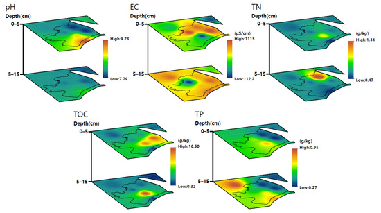 Spatial distribution characteristics of soil pH, EC, TN, TOC, and TP.