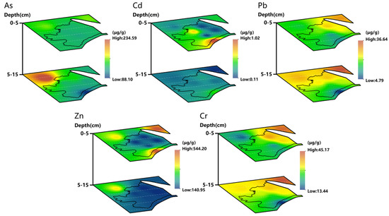 As shown in Figure 4, from the horizontal profile, the As content of soil in the horizontal profile of 0–5 cm was obviously evenly distributed and was relatively low in the study area, while in the horizontal profile of 5–15 cm, the area with relatively high As content of soil appeared in the northwest of the study area, that was, outside the uranium tailings pond. From the vertical profiles, the area with relatively high As content in soil showed a trend of expanding with increasing soil depth. From the analysis of horizontal and vertical profiles, the area with a relatively high Cd content in soil had a sporadic distribution in the uranium tailings pond, decreased with the increase in soil depth, and tended to be evenly distributed in the horizontal profile of 5–15 cm. The area with a relatively high Pb content in soil in the horizontal profile of 0–5 cm appeared in the east of the uranium tailings pond and its adjacent area, while in the horizontal profile of 5–15 cm, that area appeared in the east and center of the whole study area. In the vertical profiles, the area with a relatively high Pb content in soil showed a trend of increasing with increasing soil depth. From the analysis of horizontal and vertical profiles, the area with a relatively high Zn content in soil in the horizontal profile of 0–5 cm was distributed sporadically in the study area and showed a decreasing trend with increasing soil depth. From the analysis of horizontal and vertical profiles, the Pb and Cr contents in soil in study area had basically the same distribution and change in the horizontal and vertical profiles.