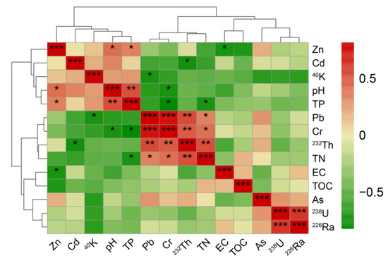 Correlation cluster heat map of soil physicochemical properties, metals/metalloids, and radionuclides,. * 0.01 < p < 0.05, ** 0.001 ≤ p < 0.01, *** p < 0.001.