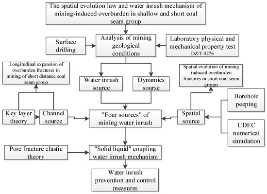 The coal seams in the mining areas of central and western China generally have the characteristics of shallow buried depth, thin bedrocks, multi-layer coal and small seam spacing. These characteristics can be collectively referred to as shallow and short coal seam group extract. First, the underlying bedrock thickness of coal seam is small, and the burial depth is no more than 150 m, so it is easy to break through under the influence of coal mining. Secondly, due to the small interval between layers in the short coal seam group, the coal seam mining seams will have a great influence on each other, and the repeated mining will continue to affect the development characteristics of overburdening. Whether there will be a water inrush phenomenon in coal seam mining is mainly affected by the following main control factors: water inrush source, abundance of water source and water pressure, water inrush channel and stagnant water space, which can be referred to as the “four source elements”, including the water inrush source, dynamic source, channel source and spatial source. When the “four source elements” constitute a complete relationship, water inrush will occur in the working face. For the problems of overburden failure and water inrush in coal seam mining under shallow buried conditions, Huang Qingxiang [1,2,3] studied the ore pressure characteristics of shallow buried coal seams and proposed the theory of “double key layers” in the roof of a near-shallow buried coal seam with large mining height. Jia Mingkui [4] studied the failure height of the overburdening after mining of thin bedrock working face and made clear the conditions of water and sand gushing. For shallow coal seam mining, Yang Dengfeng [5] studied the instability mechanism of overburdened rock under load using catastrophe theory and analyzed the main influencing factors of overburdened rock instability. Fan Limin et al. [6,7] studied the strata control and water conservation mining technology of coal seam mining under the condition of shallow burial in the ecologically fragile region of western China. Liu Quanming [8] studied the buried depth effect of the overburdened migration rule in fully mechanized caving mining under the condition of shallow buried depth and thin bedrock by using the method of a similar simulation experiment. More research focused on single coal seam mining under the condition of impact, for the shallow buried close distance coal seam group mining roof damage rule and the study of water inrush mechanisms is not very perfect, so that under the condition of close distance coal seam group occurrence, a shallow buried coal seam repeated mining group will cause the overburden rock fracture channels and severe changes of the space, causing a water inrush mechanism different from those of single coal seam mining conditions. Therefore, it is of great significance to study the failure law of roof overburdening and the water inrush mechanisms of shallow and short-distance coal seam group mining (Figure 1 research methodology flowchart) and grasp its evolution law to prevent the occurrence of water disasters.