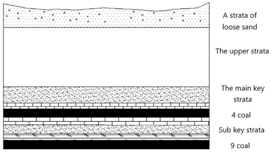 In the coal seam No. 4 mining, the main key layer (rock No. 10, referred to as key layer 1) plays a dominant role in controlling the activities of the overburden (Figure 2). When the coal seam No. 4 is exhausted, the coal seam No. 9 is mining, and the sub-key layer (rock layer No. 14, referred to as key layer 2) becomes the main key strata of the overburden of the coal seam No. 9. The key strata structure has changed a single key layer of the upper structure (Figure 3), which can present typical rock pressure characteristics of strata behavior.