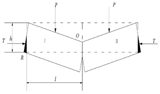 After the initial fracture of the key strata, the two rock blocks form an arch equilibrium state (Figure 4). The horizontal extrusion force T can be considered as the action point at a/2 (Figure 5), the load borne by the key strata is p and the length and height of the rock block are l and h, respectively. The moment balance is obtained for point O to obtain the balance curve formula without sliding instability: