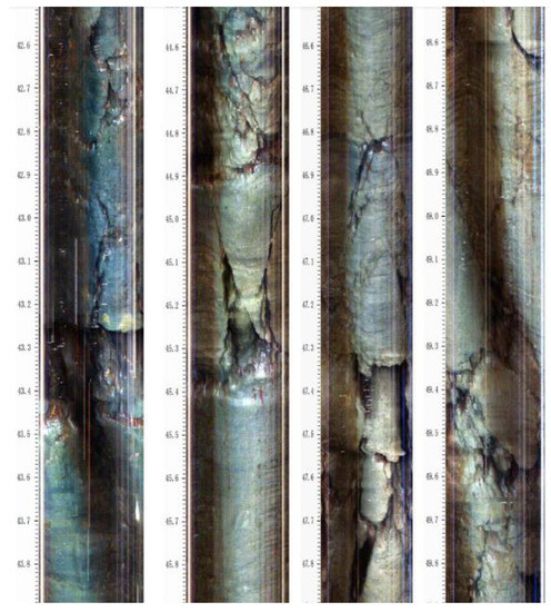 The structure of goaf and overburdening after mining can be divided into relatively complete layered structure, massive structure and broken structure, according to the degree of fragmentation and form, and the overall combination mode is closely related to the size of the water accumulation space. In the original strata of mining, the water accumulation space mainly exists in rock micro fractures. After coal mining, the violent development of overburden fractures leads to the rapid expansion of the water accumulation space, and rocks in the overburden fracture zone are massive structure rocks (see Figure 7), so the water accumulation space is mainly distributed in the pore fracture channel. The rock mass in the caving zone, which has been seriously damaged, presents a broken structure, and the overburden space is fully developed, as is the main water accumulation area. The spatial evolution characteristics of mining-induced overburden fractures are simulated by numerical simulation.