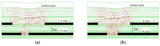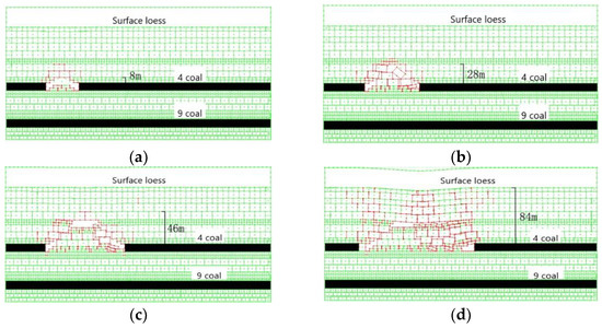 The following 40,201 working face area of Xialiyuan Coal Mine is taken as an example. According to the strata distribution and physical and mechanical parameters of coal and rock in Table 1, UDEC numerical simulation software is used to establish a numerical analysis model to simulate the spatial variation characteristics of overburdened fractures in the process of coal seam group mining (see Figure 8 and Figure 9) [16].