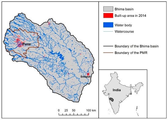The emerging megacity Pune is located upstream in the Bhima basin (Figure 1). Its metropolitan region (PMR) consists of the municipal corporations Pune and its twin city Pimpri Chinchwad, as well as adjacent villages. Hosting ~8.36 million residents, PMR is the basin’s largest agglomeration, followed by Solapur with ~1.2 million residents [69]. Pune is one of India’s most rapidly growing cities. It features high density and rapid demographic and spatial expansion with associated land use change at the fringe, and it has high socio-economic and cultural diversity [70]. Typical for emerging megacities, the city faces infrastructural deficits (insufficient water, energy, and transport systems), as well as regulatory and governance problems due to institutions being incapable of keeping up with the city’s rapid expansion. Kantakumar et al. [71] show that urban growth has been largely unregulated in the past, despite development plans.