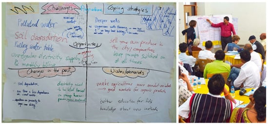 Affected resource user workshop: In the first workshop (Figure 2), a total of 30 stakeholders from farmers’/citizens’ associations (10), urban and environmental NGOs (11), research (5), and small companies (4) discussed current and potential future challenges, their coping strategies, and ideas for policy responses. The moderation team employed a specific appreciative approach (“Art of Hosting” [75]) and made it clear from the outset that their task was to learn and to listen. Different methods, e.g., visioning or storytelling were applied to motivate participants to share their challenges and coping strategies. The stakeholders were presented with different future perspectives related to business as usual trajectories of climate change and urbanization, and they discussed how these might influence their daily lives. This was done in four small groups of five to ten participants of similar backgrounds (e.g., groups of farmers, urban residents/activists, environmentalists), each with one facilitator and one note-taker. The setup resembled, in format and intention, a set of parallel focus group discussions [76]. The results were harvested on flipcharts, filled-in templates, notes, and audio recordings (see Supplementary Materials).