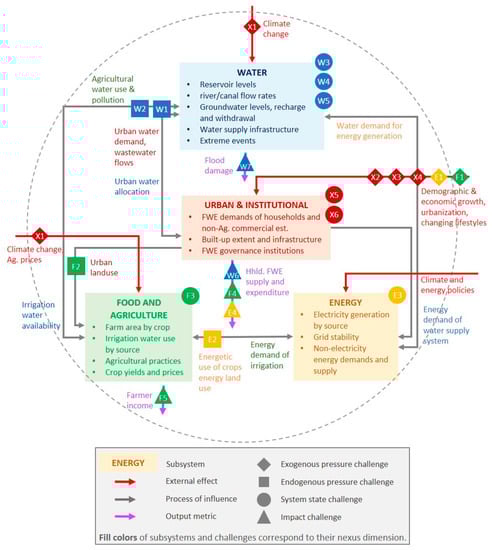 The system boundaries (dashed line) are defined physically by the Bhima basin and sectorally by the urban FWE nexus. Within these boundaries, four subsystems have been selected for analysis: all FWE nexus dimensions, as well as an urban and institutional subsystem. Subsystems can be broken down into smaller components defined by variables and indicators, such as electricity generation by the various sources, piped water infrastructure extent, yields per crop and area, and industrial resource consumption. State challenges, constituting each subsystem in the form of round symbols, are found in the subsystems’ upper right corner. Most subsystems are interlinked with bidirectional (fewer with unidirectional) processes of influence (grey arrows), such as the effect of urban land use change on agriculture or the agricultural energy demand for water pumping. Corresponding endogenous pressure challenges are symbolized in squares on the arrows. External effects, as defined by the exogenous pressure challenges, encompass biophysical changes related to climate change, as well as demographic and socioeconomic drivers. They are illustrated as red arrows from outside the system boundary with diamond-shaped challenges. Lastly, output metrics, e.g., the number of households with certain levels of FWE supply, are depicted as purple arrows and match the impact challenges (triangles).