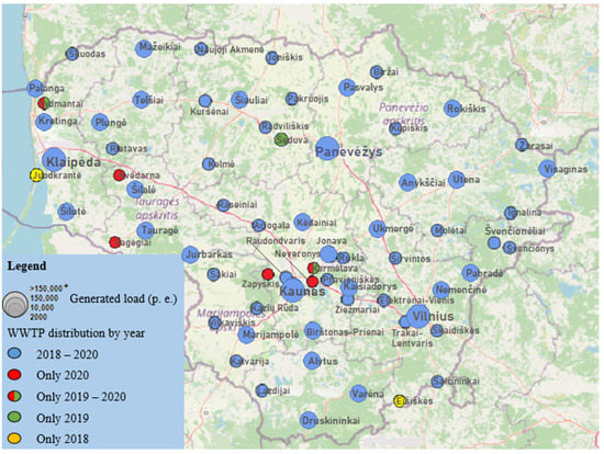 The analysis was performed by assessing the current situation according to the data from 2018–2020. Those indicators for which long-term trends are important, such as prevention indicators, were analyzed over the period 2002–2020. There are some 630 municipal wastewater treatment plants in Lithuania. Our assessment concentrated on municipal WWTPs in agglomerations where more than 2000 p.e. of wastewater is generated. In 2020, there were 67 such agglomerations, while in 2019 and 2018, there were 65. In 2020, the population of the country was 2,794,885 [22]. Over the past three decades, the population has been declining and redistributing as more people, as well as economic activities, are concentrated in major cities. For comparison: in 2006, as many as 95 agglomerations were identified [23]. Thus, the number of agglomerations producing at least 2000 p.e. of wastewater is declining, but where the population is concentrated, new agglomerations with >2000 p.e. are recorded (see Figure 1). There are five WWTPs in the country that receive loads exceeding 100,000 p.e.