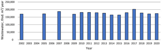 The total annual amount of wastewater to be treated in Lithuania fluctuates, but in the long term it remains relatively stable (see Figure 2). Wastewater treatment plants in agglomerations of more than 2000 p.e. account for ~86–87% of this volume [24]. Thus, the overall quality of wastewater in Lithuania depends mainly on wastewater treatment in these agglomerations. The rest of the domestic and industrial wastewater to be treated is discharged from industrial enterprises, small settlements, and other facilities.