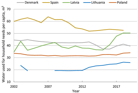 As much as 90% of the overall water consumption is in the energy sector, which mainly uses surface water. Excluding the energy sector, the main use (58%) is for domestic purposes [25]. It is household needs that have seen an increase in water consumption in recent years, both in absolute terms and per capita. Nevertheless, per capita consumption in Lithuania is still low compared to that of other European countries (see Figure 3). The 1990s and the first decade of the 21st century saw low consumption, mainly due to rising water prices, which encouraged people to save water. The recent increase in per capita consumption is due to the improving standard of living, with a significant number of people moving to private houses, where they grow lawns and vegetables. Climate change is exacerbating extreme weather events, with drought and heat increasing the need for irrigation. Water suppliers are recording a particularly significant increase in water consumption during the heat, especially in the mornings and evenings, when people water their lawns. However, the water used for irrigation does not enter the sewage, which needs to be treated. The increase in consumption per capita can also be linked to the number of emigrants returning temporarily during their holidays.