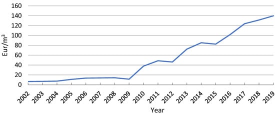 Other water users are industry (20.5%), fisheries (19.5%), and agriculture (1.5%). The water productivity index (Figure 4) indicates the increasing efficiency of water use in the country; it shows that economic output produced per cubic meter of fresh water abstracted has almost tripled over the past two decades [27]. Compared to other European countries, water productivity in Lithuania is average or even higher. In 2019, water productivity, expressed in EUR/m3, was 139.9 in Lithuania, 134.3 in Latvia, 51.2 in Poland, 310.8 in Denmark and 18.8 in Greece. However, the possibility of comparing countries is limited, as the productivity index is strongly influenced by the economic and industrial structure of the country, i.e., whether or not water-intensive economic activities predominate. The increase in water productivity in Lithuania could be attributed both to the increasing efficiency and to the changing profile of economic activities as the IT sector, which does not require much water, grows.
