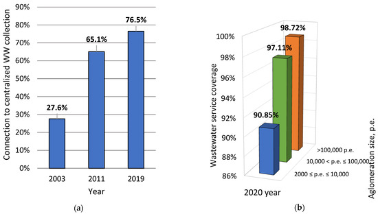 Wastewater service coverage: (a) development of wastewater service coverage [18]; (b) percentage of inhabitants connected to centralized wastewater collection depending on agglomeration size. Calculated based on [16].