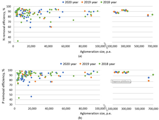 The maximum and minimum efficiency of nitrogen and phosphorus removal varies over a relatively wide range, especially in smaller treatment plants (Figure 6). Efficiency was calculated as the percentage reduction in the total load of nitrogen (N) and phosphorus [21].