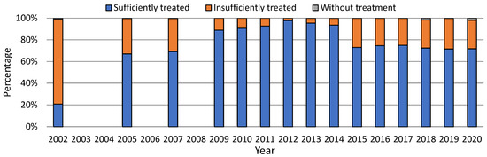 The vast majority of the analyzed WWTPs use conventional biological treatment with activated sludge. WWTPs above 10,000 p.e. are obliged to apply tertiary treatment for better nutrient removal [1,17]. Still, interviews with treatment plants have shown that if the required degree of treatment is achieved and maintained, some treatment plants tend to apply biological treatment only. At the same time, the achieved removal efficiency in some WWTPs is insufficient to ensure the required quality of the effluent. Depending on the condition of the receiving water bodies, Lithuania may set stricter requirements for wastewater discharge than required by the UWWTD [31]. Some WWTPs, even if they comply with the requirements of the directive, do not meet the specific requirements for their discharge. This is especially relevant for the largest wastewater treatment plant in the capital, which, due to the increased pollution load, is unable to cope with it and achieve the permissible N concentration in the discharge. It contributes strongly to the fact that since 2015, the share of insufficiently treated wastewater in the country has increased again. In 2020, sufficiently treated wastewater accounted for only 71.7%, while in 2012, it was as high as 97.8% (see Figure 7). In 2018–2020, the permitted N and/or P concentrations were exceeded in the water discharged by WWTPs in another ten agglomerations [17,24].