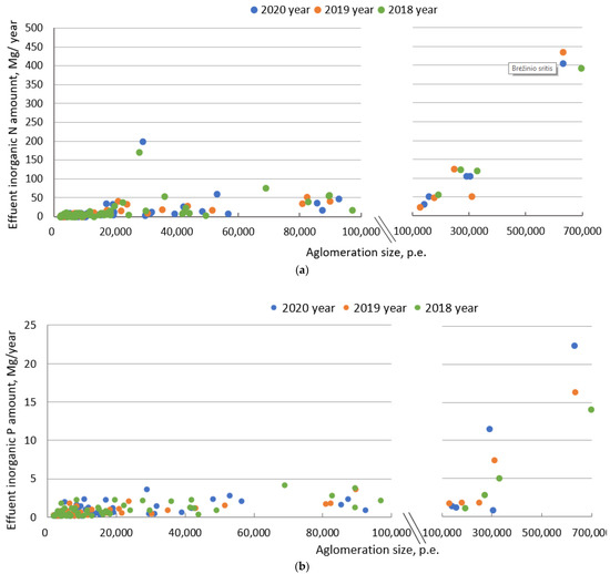 Most of the nutrient load is caused by a discharge from large agglomerations (see Figure 8). It is therefore very important that they achieve a high degree of purification. Unfortunately, it is the largest WWTP that is having difficulty achieving the required nitrogen purification. Almost half (46.4–49.6%) of the inorganic nitrogen load comes from treatment plants larger than 100,000 p.e.; their contribution to inorganic phosphorus load is slightly lower, 31.0–43.4%. The share of inorganic nitrogen and inorganic phosphorus is quite high: 76–76% for N and 52–55% for P (Table 2). This can be compared with neighboring Poland, where in recent years the average share of inorganic nitrogen in the riverine nutrients loads was 64%, while that of inorganic phosphorus was 35% [33]. Again, the large percentage of the inorganic part of discharges in Lithuania is largely determined by the largest WWTP; without it, the share of inorganic nitrogen would be 54–56%, and the share of inorganic phosphorus would be 40–42%.