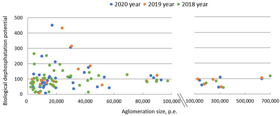 The biological dephosphatation potential indicator was calculated as a ratio of chemical oxygen demand and total phosphorus concentration (COD/TP) in the influents [21]. This indicator shows how P tends to be removed from wastewater during biological treatment. Values below 50 indicate that sufficient dephosphatation is unlikely to be achieved without additional chemical purification, such as the use of metal salts [34,35,36]. However, any introduction of additional chemicals may interfere with and adversely affect further processes, such as phosphorus recovery or other uses of sludge. Figure 9 shows that the characteristics of wastewater from the examined Lithuanian WWTPs are very different. Low COD/TP ratios, which complicate the biological treatment of phosphorus, are more common in smaller wastewater treatment plants.