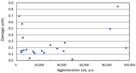 According to the literature, the average damage units per 1 g of P in untreated sewage sludge are approx. 0.5 [21,38]. In the case of Lithuanian WWTPs, the median value was 0.16, which is considerably lower (Figure 10). It is even lower than the average value of 0.23 for the commercial fertilizer single superphosphate [21,38]. Nevertheless, the harmfulness of sludge differed greatly between different treatment plants, with the values of damage units ranging from 0.0175 to 0.84. The result seems to be largely determined by the metal contamination of the wastewater entering the treatment plant. High concentrations of Zn, Cd, and sometimes Hg are most common; in some cases, they even exceed the limit values applicable to sludge category II.