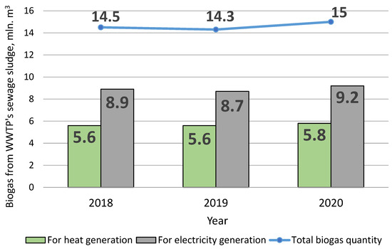 Sewage, including the water itself and the sludge generated during its treatment, has a considerable potential for the recovery of the materials and energy it contains [14,46]. In terms of recovery of materials, perhaps the best known is the return of nutrients to their cycles through spreading on the soil as well as the extraction of phosphorus itself [12,38,47]. Energy can also be recovered from wastewater. In this case, the production and use of biogas for energy generation is the most widely used choice [48]. Recovery of these resources from Lithuanian WWTPs is examined further in more detail. However, in fact, a much wider variety of materials, such as biopolymers, cellulose, and metals, can be recovered from wastewater [4,7,49,50]. Energy can also be recovered not only through biogas, but also, for example, the heat from the effluent can be used [7,51]. Unfortunately, we did not find any examples of such recoveries in Lithuanian wastewater treatment plants.